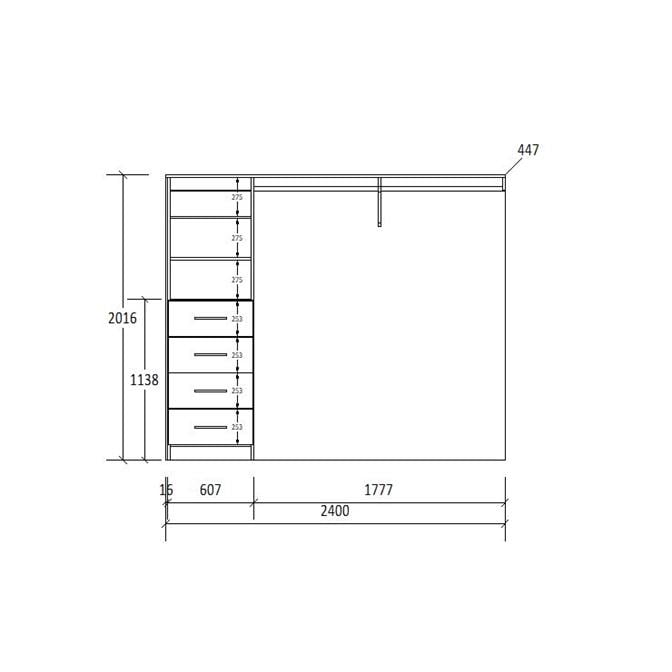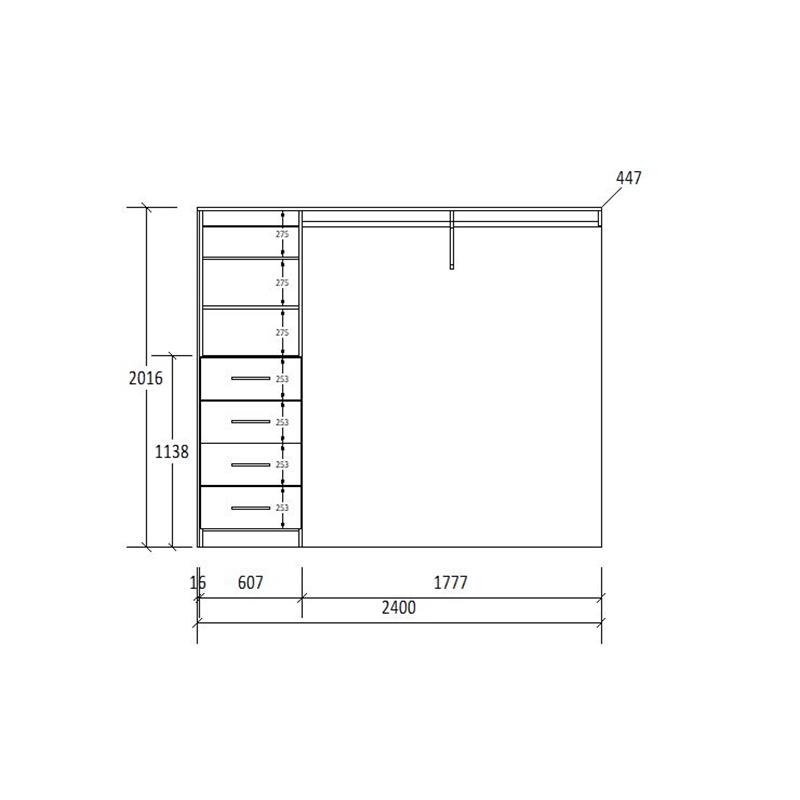 The Galleria Wardrobe 5.0 is a versatile DIY wardrobe solution. Featuring four drawers, adjustable shelves, and ample long hanging space, it's perfect for your longer items and ideal for wider and larger wardrobe openings.