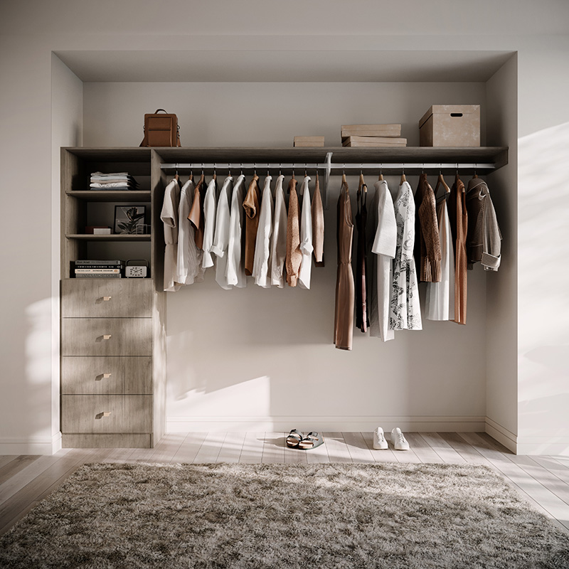The Galleria Wardrobe 5.0 is a versatile DIY wardrobe solution. Featuring four drawers, adjustable shelves, and ample long hanging space, it's perfect for your longer items and ideal for wider and larger wardrobe openings.