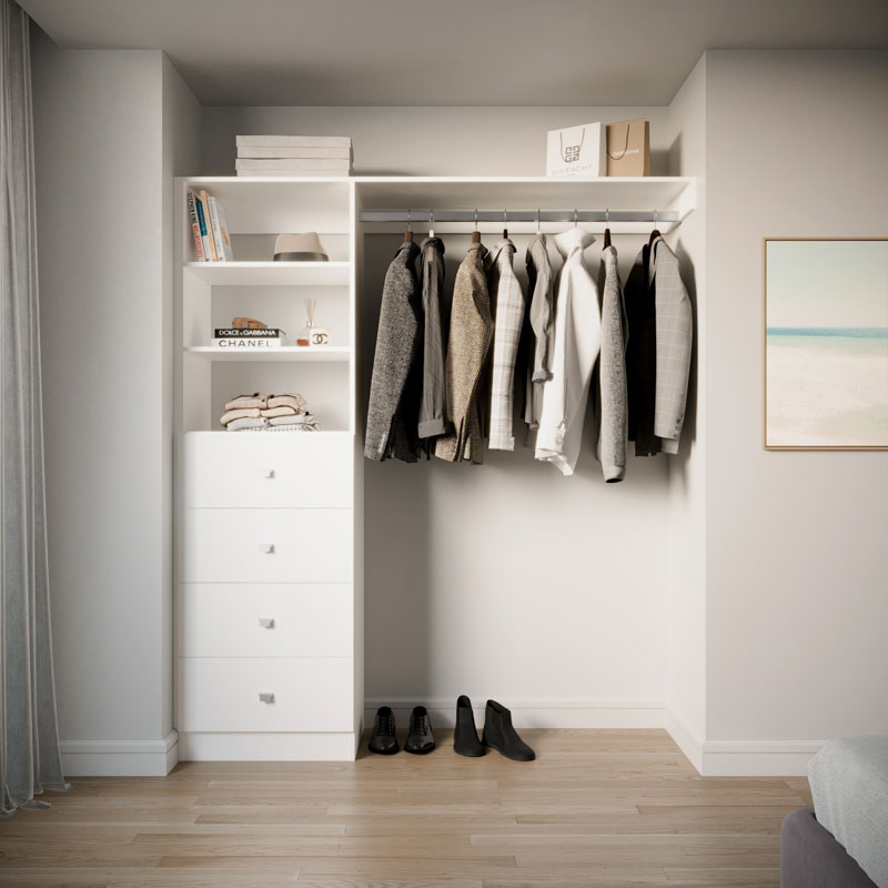 Choose from four on-trend colours and nine handle options. The reversible design adapts seamlessly to your space. With four drawers, adjustable shelves, and spacious long hanging, it's perfect for your long dresses, suits and more. Elevate your storage with Galleria BIR4.9.