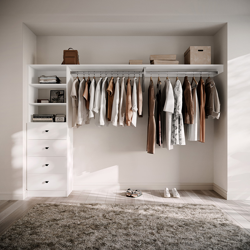 The Galleria Wardrobe 5.0 is a versatile DIY wardrobe solution. Featuring four drawers, adjustable shelves, and ample long hanging space, it's perfect for your longer items and ideal for wider and larger wardrobe openings.