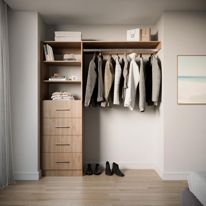 Choose from four on-trend colours and nine handle options. The reversible design adapts seamlessly to your space. With four drawers, adjustable shelves, and spacious long hanging, it's perfect for your long dresses, suits and more. Elevate your storage with Galleria BIR4.9.