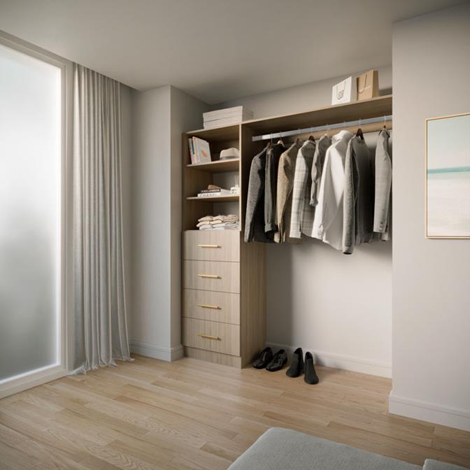 Choose from four on-trend colours and nine handle options. The reversible design adapts seamlessly to your space. With four drawers, adjustable shelves, and spacious long hanging, it's perfect for your long dresses, suits and more. Elevate your storage with Galleria BIR4.9.