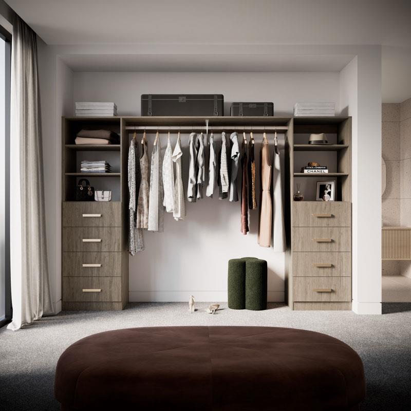 Featuring eight drawers, adjustable shelves, and versatile hanging space, it suits all your wardrobe needs and fits well in wider and larger wardrobe openings. Perfect for accommodating the belongings of two individuals, this wardrobe is your go-to storage solution.