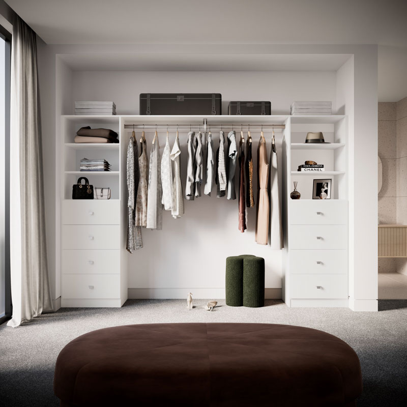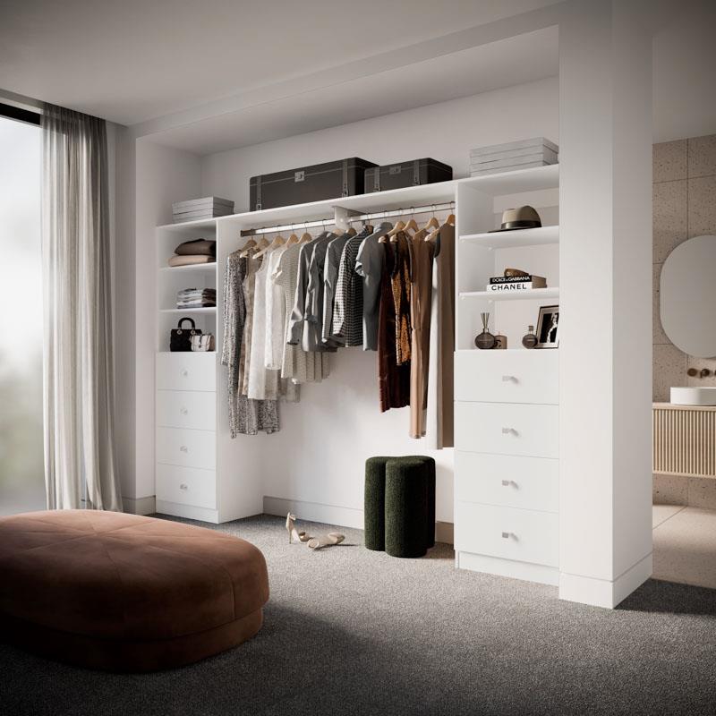 Featuring eight drawers, adjustable shelves, and versatile hanging space, it suits all your wardrobe needs and fits well in wider and larger wardrobe openings. Perfect for accommodating the belongings of two individuals, this wardrobe is your go-to storage solution.